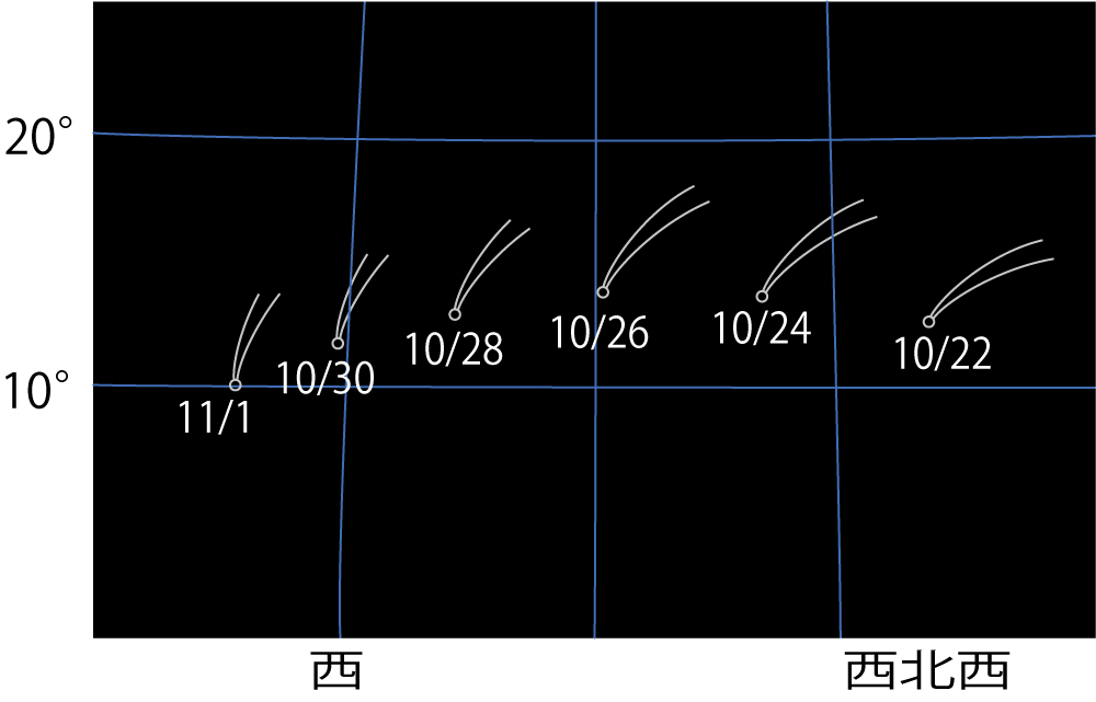 日本からは10月中旬くらいから,夕方西空に条件良く見えてきます。独自判断になりますが,明るく見やすい期間日時として,10月24日〜28日(18時半〜19時)をあげたいと思います。(もちろん,その前後も十分に見えています。)